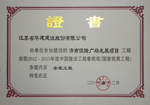 濟南恒隆廣場喜獲“2012-2013年度中國建設工程魯班獎(國家優質工程)” 時間:2013-12-09 5799 12月5日,2012-2013年度中國建設工程魯班獎表彰大會在北京友誼賓館舉行,中國建筑業協會對2012-2013年度國內優秀建筑工程進行了隆重表彰,上海公司參建的濟南恒隆廣場喜獲全國建設工程最高榮譽——“魯班獎”,這是我公司第一次獲此殊榮。江蘇華建副總經理、上海公司總經理楊杰出席了頒獎大會。