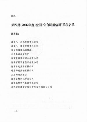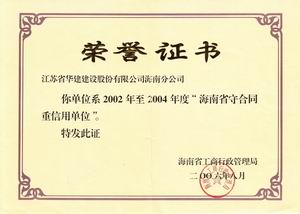 企業誠信榮譽 時間:2019-01-01 9058 2001-2002年度海口市守合同重信用 2003-2004年度海口市守合同重信用 2005-2006年度海口市守合同重信用 2002-2004年度海南省守合同重信用 2006年度全國守合同重信用1 2006年度全國守合同重信用2 2006年度全國守合同重信用3 2006年度全國守合同重信用4 2012年度海南省守合同重信用