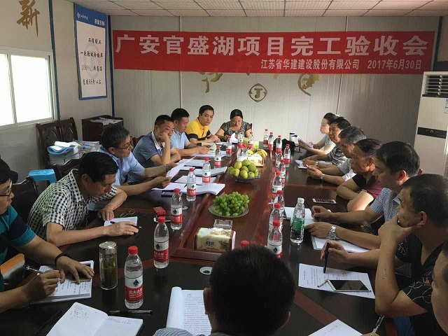 華建第一壩——官盛湖大壩工程順利通過完工驗收 時間:2017-07-03 4134 6月30日上午,華建首個水利項目——官盛湖大壩工程完工驗收會在項目會議室召開,廣安官盛新區管委會副主任蔣成文主持會議。經項目勘察、設計、監理、區住建局、質監站、水務局、發改局、財政局等單位和業主現場代表實測檢查、分別總結匯報后,一致同意工程驗收合格。 官盛湖大壩作為一項以城市景觀為主、兼有防洪功能的綜合性水利工程,主要由樞紐工程、泄洪渠工程組成。官盛湖湖區總庫容987.73萬立方米,壩頂長349米,最大壩高48.5米,壩體填筑總量達157.93萬方。
