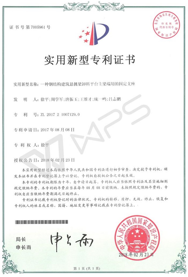 近日,從國家知識產權局傳來喜訊,公司申請的《一種鋼結構建筑懸挑梁卸料平臺主梁端用的固定支座》獲得實用新新型專利授權。