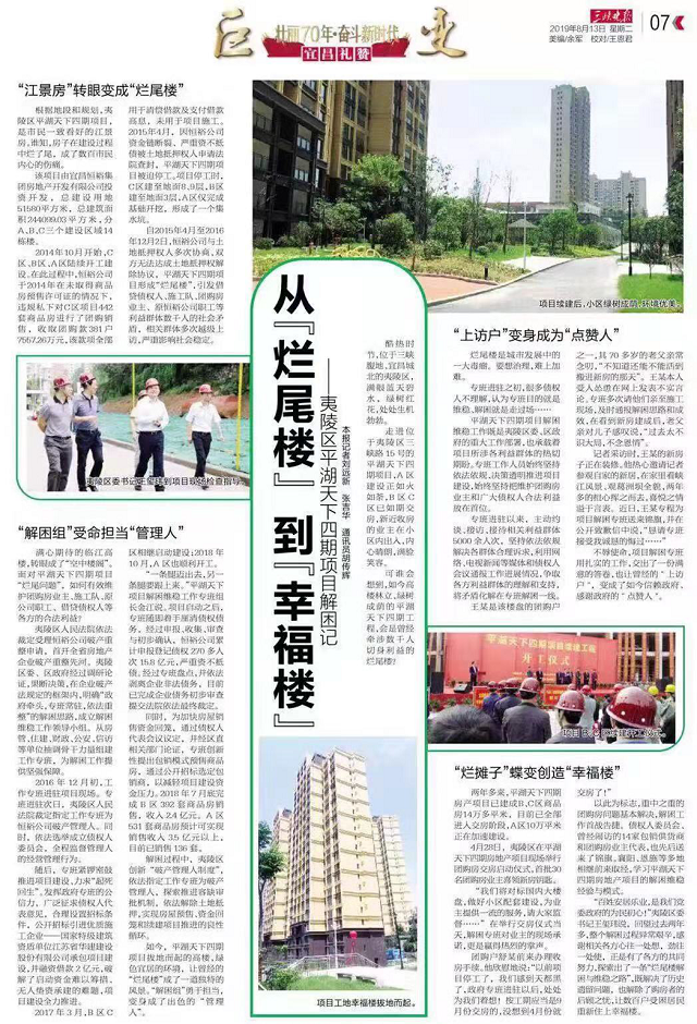 8月13日《三峽晚報(bào)》第7版整版報(bào)道了江蘇華建宜昌分公司總承包建設(shè)的平湖天下四期項(xiàng)目“從爛...