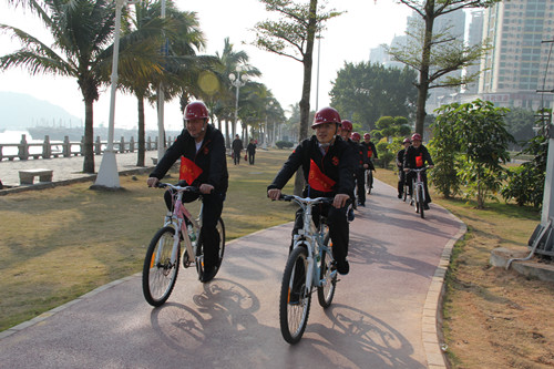 2012年元旦,珠海公司開展騎自行車迎新年活動。機關(guān)全體員工統(tǒng)一著裝,頭戴印有江蘇華建標識...