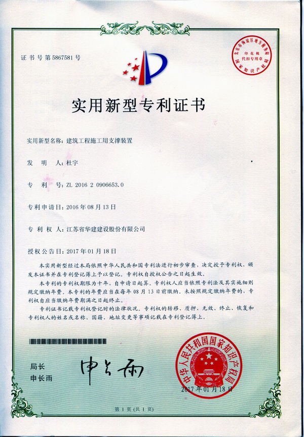 近日,海南分公司《建筑工程施工用支撐裝置》成果獲得國家知識產(chǎn)權(quán)局專利授權(quán),被授予國家實用新...