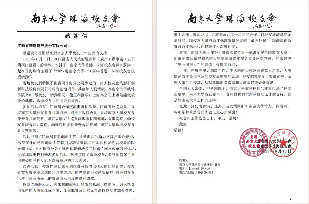 近日,公司收到香港南京大學(xué)校友會、南京大學(xué)珠海校友會聯(lián)合發(fā)來的《感謝信》。6月7日,在江蘇...