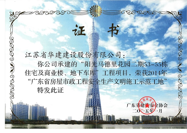 陽(yáng)光馬德里二期工程榮獲2014年廣東省房屋市政工程安全生產(chǎn)文...
