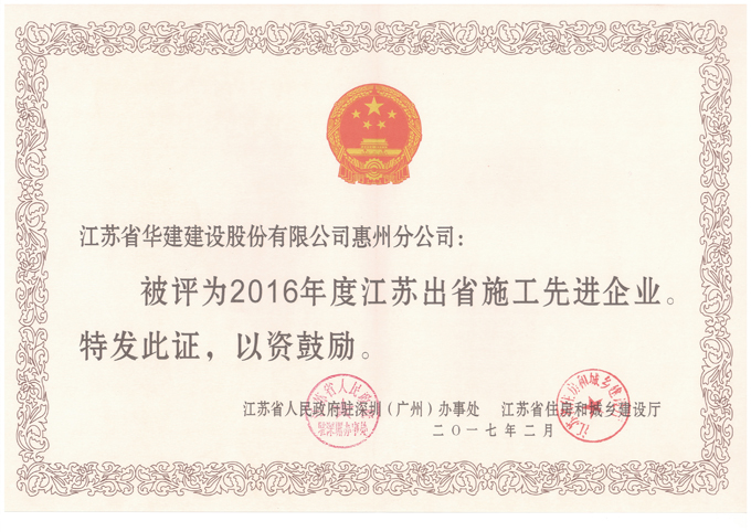 惠州公司榮獲“2016年度江蘇出省施工先進企業”稱號 時間:2017-03-28 2895 3月24日,江蘇省人民政府駐深圳(廣州)辦事處和江蘇省住房和城鄉建設廳在???/FONT>召開2017年江蘇建筑業南方區工作會議,表彰了一批施工先進企業、優秀企業經理、優秀建造師和先進個人?;葜莨精@評“2016年度江蘇出省施工先進企業”,總經理周群利被評為優秀企業經理,黃秀剛被表彰為質量安全先進個人,邵群斌被表彰為經營財務先進個人,劉磊被表彰為新聞報道先進個人。