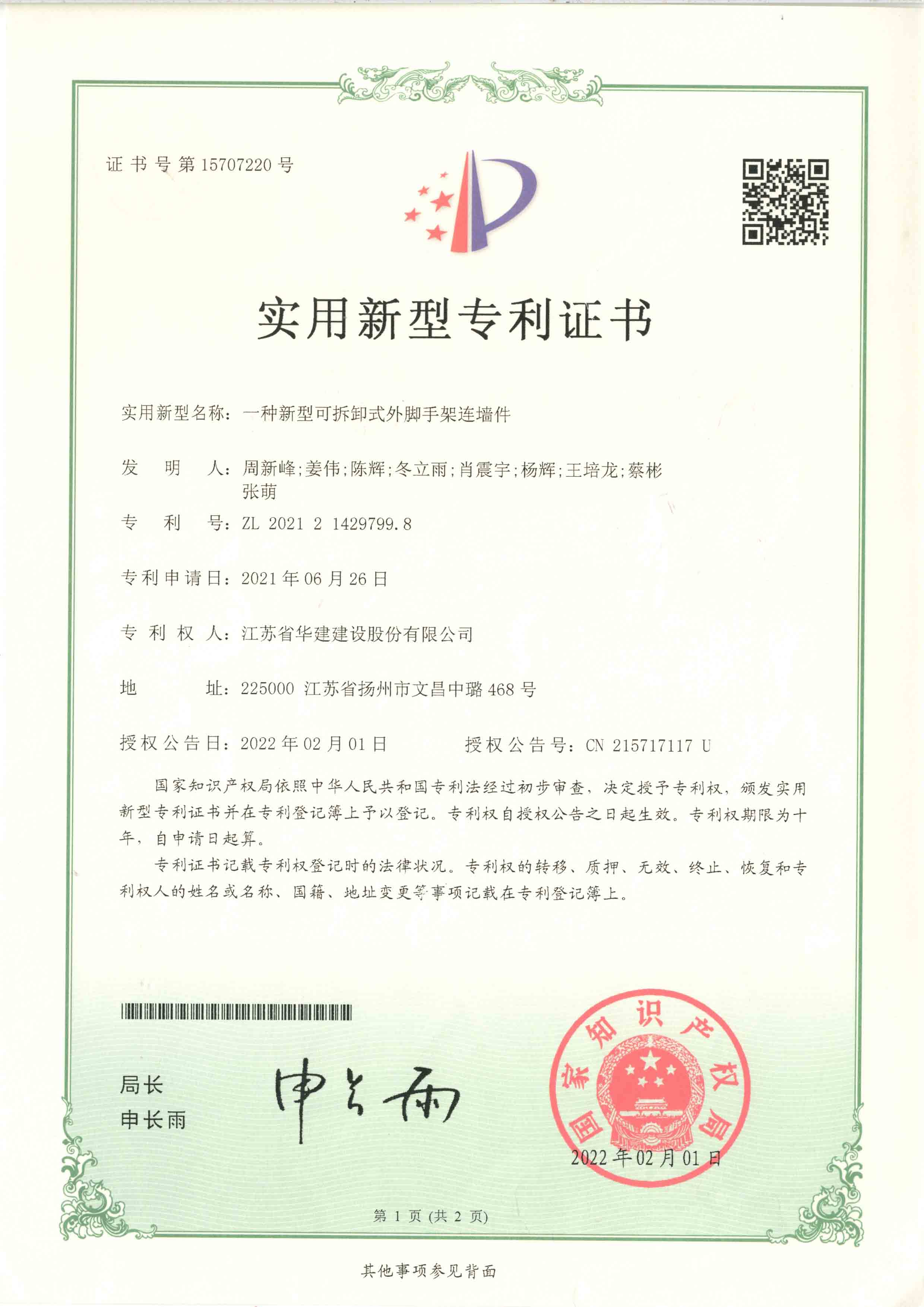 北京分公司2022年度已取得兩項實用新型專利證書 時間:2022-08-22 4155 日前,國家知識產權局頒發了實用新型專利證書,公司兩項專利取得實用新型專利證書,分別是:一種新型可拆卸式外腳手架連墻件、一種鋼筋混凝土現澆板板厚高精度控制裝置。