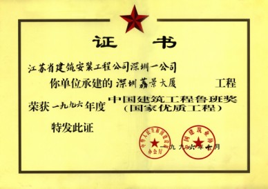 荔景大廈獲:深圳市優(yōu)質樣板工程(第一名)、江蘇省優(yōu)工程(金牌)、江蘇省揚子杯獎、江蘇省名牌工程、揚州市瓊花杯獎、1996年度建筑工程魯班獎。
