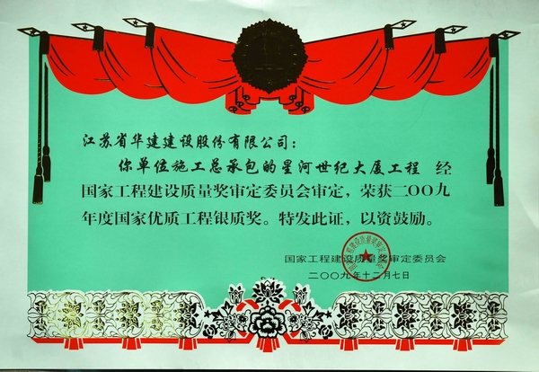星河世紀大廈 時間:2010-01-19 8845 該工程位于深圳市福田區深南大道南與彩田路西交匯處,是深圳市中心區東門標志性建筑。該工程一裙三塔,32-39層,高173.2米,總建筑面積156680平方米,是集辦公、商業、住宅為一體的綜合樓。 該工程先后榮獲2006年度“深圳市安全生產文明施工優良工地”、2007年度深圳市優質工程“金牛獎”第一名、2007年度廣東省優良樣板工程獎、2007年度江蘇省“揚子杯”省外優質工程獎,2009年12月被評為2009年度國家優質工程銀質獎。
