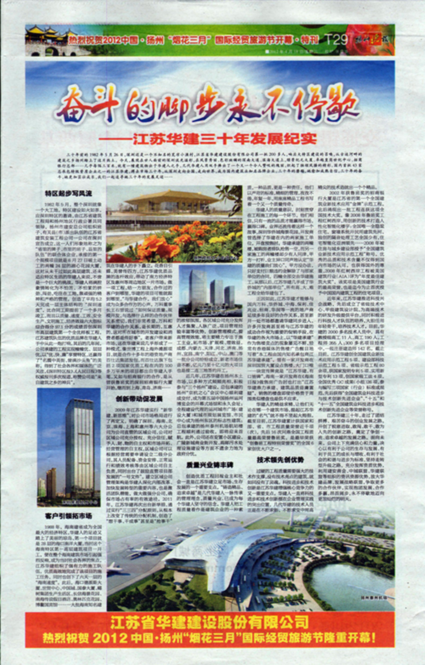 《揚州晚報》專版刊發公司三十周年宣傳文章 時間:2012-04-19 6450 4月18日,《揚州晚報》T29版刊發專版文章《奮斗的腳步永不停歇——江蘇華建三十年發展紀實》,從公司起步、市場開拓、創新發展、質量與科技等各個層面,介紹了公司三十年的奮斗歷程、綜合實力和發展業績。