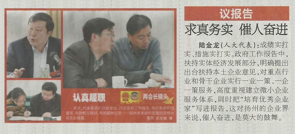 元月7日的《揚州日報》焦點新聞欄目報道了我公司董事長陸金龍參加揚州市七屆人大二次會議的有關情況。本次人代會6日上午在揚州會議中心隆重開幕,作為市人大代表,陸董事長在會上認真參與對朱民陽市長代表政府所作工作報告的討論,并圍繞“六個基本”抓發(fā)展、合力推進“三個揚州”和世界名城建設、加快建設更高水平小康社會積極建言獻策。《揚州日報》在人大代表“議報告”中第一個刊登了陸董事長的發(fā)言:“成績實打實、措施實打實。政府工作報告中,扶持實體經濟發(fā)展部分,明確提出出臺扶持本土企業(yè)意見,對重點行業(yè)和骨干企業(yè)實行一業(yè)一策、一企一策服務,高度重視建立微小企業(yè)服務體系,同時把‘培育優(yōu)秀企業(yè)家’寫進報告,這對揚州的企業(yè)界來說,催人奮進,是莫大的鼓舞。”