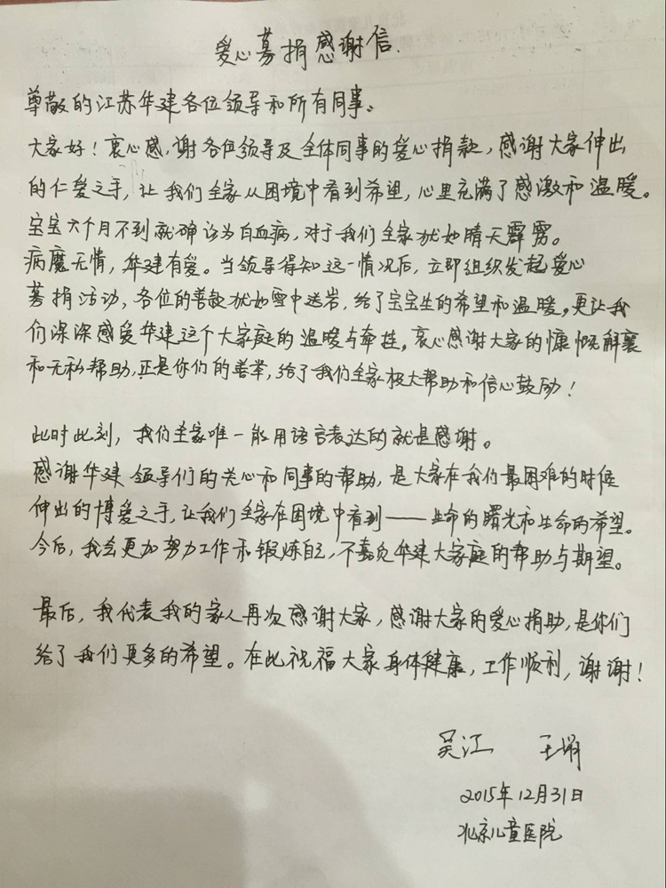 吳江是新加坡蘇揚(yáng)公司的員工,近期他六個(gè)月大的兒子被診斷患有白血病,給他的家庭帶來了極大的精神負(fù)擔(dān)和經(jīng)濟(jì)壓力,孩子患病消息也牽動(dòng)著公司廣大干部員工的心,得知這一消息后,公司黨委高度重視,工會(huì)迅速發(fā)起愛心募捐倡議,各單位、各部門廣大干部員工踴躍奉獻(xiàn)愛心,截至目前已經(jīng)籌集愛心捐款十萬余元。吳江特意發(fā)來感謝信,對(duì)給予其家庭幫助的同志們表示誠摯感謝!