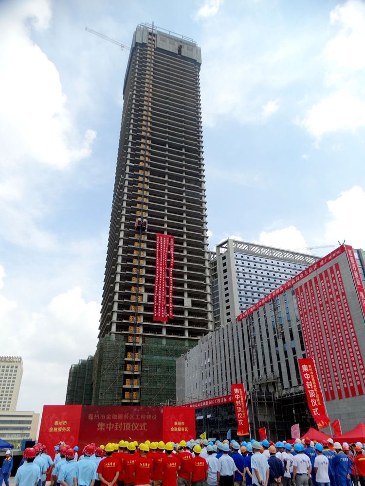 泰州金融服務(wù)區(qū)項目是泰州重點(diǎn)工程項目,共20幢樓宇、70多萬平米總面積,是泰州建市以來投資總量最多、單體建筑規(guī)模最大的建筑群。江蘇華建在泰州金融服務(wù)區(qū)共承包了10幢大樓的施工任務(wù),施工標(biāo)段的總面積約27.9萬平方米。其中:6號樓主樓58層,為超高建筑,設(shè)計高度為248米,裙樓7層,主樓裙樓總建筑面積約115900平方米。這一蘇中第一高樓,不僅是泰州地區(qū)第一棟主體為鋼筋混凝土核心筒+外框鋼結(jié)構(gòu)形式的超高層建筑,而且在蘇中地區(qū)也是單體鋼結(jié)構(gòu)高度最高的建筑,用鋼量多達(dá)8000噸。其將在130米高空建設(shè)空中游泳池,同時在230米的高度,建設(shè)空中旋轉(zhuǎn)餐廳。