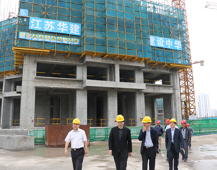 在公司承建的恒大外灘中心施工現場,朱市長與項目管理人員一一握手,向大家表示親切問候。在陪同人員引導下,他饒有興致地邊走邊看,聽取項目負責人對工程特點、工程進展、工程用材等方面的情況匯報,不時點頭稱贊施工人員的工藝水平和施工技藝,并與項目部主要管理班子親切合影。