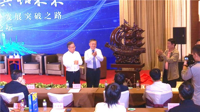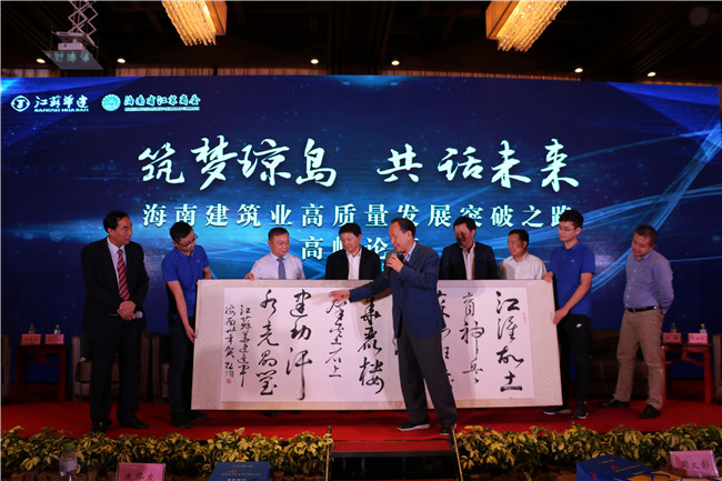 論壇上,原海南省委常委、宣傳部長、國家行政學(xué)院原副院長周文彰欣然為江蘇華建進(jìn)瓊?cè)苣曩x詩題字:“江淮沃土育神兵,蘇北班輸天下行。華麗樓群基石上,建功汗水亮晶瑩”。