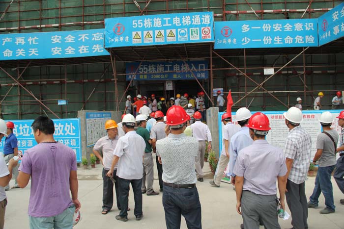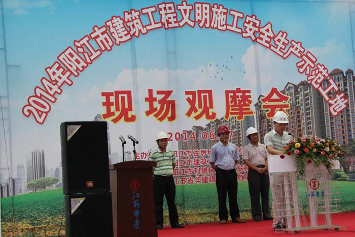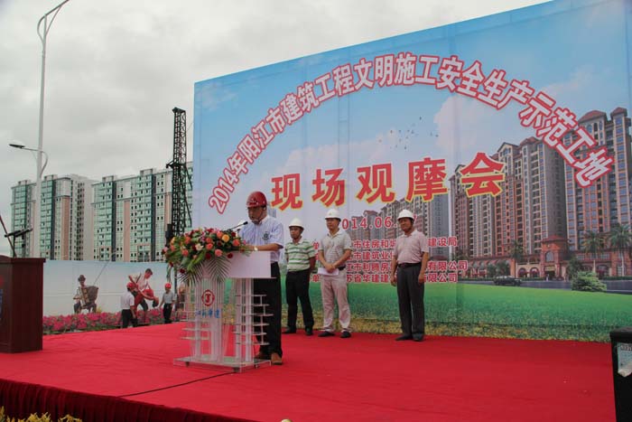 6月17日上午,“2014年陽江市建筑工程文明施工安全生產(chǎn)示范工地現(xiàn)場觀摩會”,在我公司第一項(xiàng)目部施工的陽光馬德里二期工程項(xiàng)目現(xiàn)場舉行。陽江市建設(shè)局副局長馮成富、質(zhì)量安全監(jiān)督站站長林子歡、書記何聲海和各縣(市、區(qū))住建局安全生產(chǎn)分管負(fù)責(zé)人、安監(jiān)站站長以及所有施工、監(jiān)理單位負(fù)責(zé)人、安全管理人員近300人參加觀摩會。