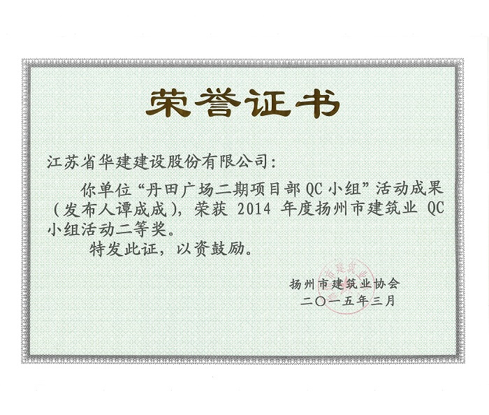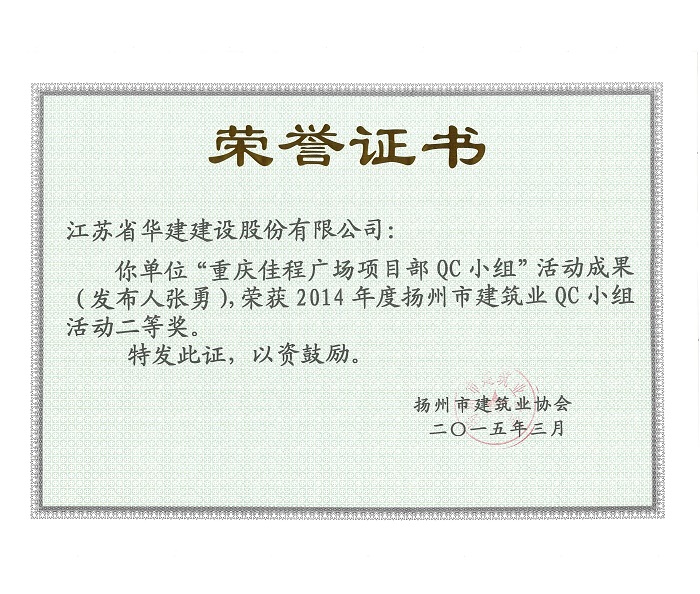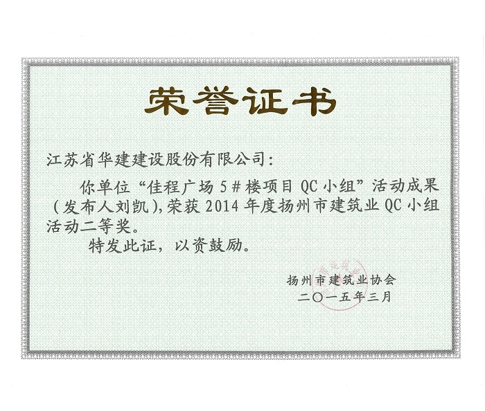 近日,揚州市建筑業(yè)協(xié)會發(fā)文表彰了2015年度全市建筑業(yè)QC小組活動成果獎,公司共有5項成果獲獎,其中,“孔令正QC小組”活動成果《剝蝕丘陵地貌多形截面鋼筋混凝土灌注樁施工新方法》榮獲一等獎,“佳程廣場5#樓項目QC小組”活動成果《提高核心筒筒體結構施工質量》、“重慶佳程廣場項目部QC小組”活動成果《提高現(xiàn)澆混凝土樓梯結構施工質量》、“丹田廣場二期項目部QC小組”活動成果《提高蒸壓加氣混凝土砌塊外墻合格率》榮獲二等獎,“馬賽公館項目部QC小組”活動成果《 提高耐磨金剛砂地面施工質量》榮獲三等獎。