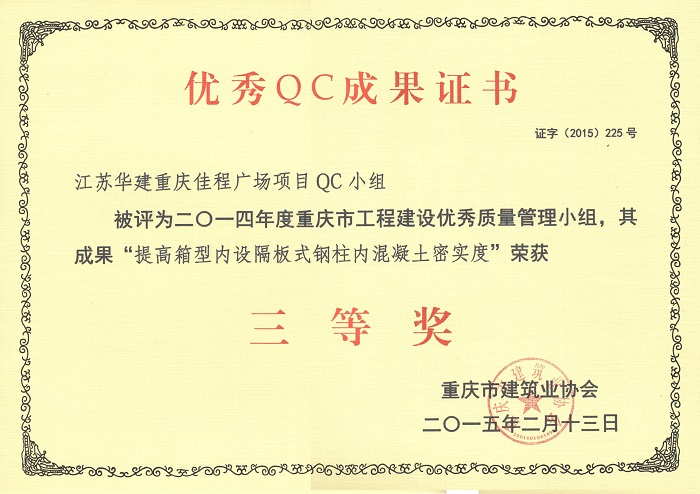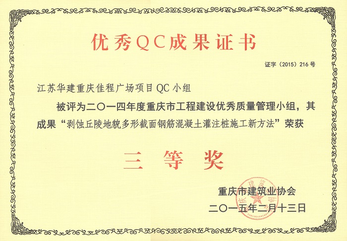 公司3項QC成果榮獲重慶市三等獎 時間:2015-04-02 5126 近日,重慶市建筑業協會發文表彰了一批優秀QC成果,公司重慶佳程廣場項目QC小組被評為2014年度重慶市工程建設優秀質量管理小組,其成果“提高箱型內設隔板式鋼柱內混凝土密實度”、“剝蝕丘陵地貌多形截面鋼筋混凝土灌注樁施工新方法”、“重慶佳程廣場基礎工程大體積混凝土裂縫成因分析和預控”等均榮獲三等獎。