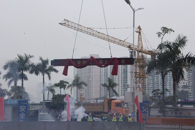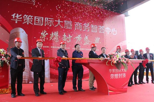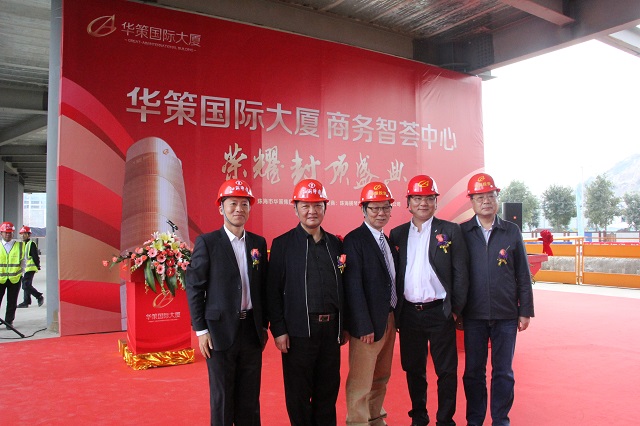 2017年1月9日,第八項目部承擔施工任務(wù)的華策國際大廈項目舉行主體結(jié)構(gòu)封頂儀式。橫琴新區(qū)黨委副書記葉真、橫琴新區(qū)建設(shè)環(huán)保局局長劉晨光,華策集團董事局主席楊峰、副主席楊智雄、總裁余道群,江蘇華建副董事長、總經(jīng)理宗有農(nóng)、珠海公司總經(jīng)理繆國樞、深圳公司常務(wù)副總吳碧橋、深圳公司副總經(jīng)理蔣超,以及來自華策集團、設(shè)計單位、參建單位、監(jiān)理單位和珠海區(qū)域公司相關(guān)人員共200余人出席儀式。華策國際大廈整體分為東塔和西塔兩部分,西塔已于2016年11月8日封頂,隨著東塔的順利封頂,華策國際大廈全面封頂,并將于2017年部分投入使用,2018年底全部投入使用。