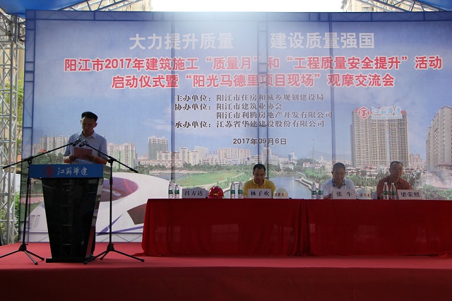 珠海區(qū)域公司總經(jīng)理呂方達(dá)出席會(huì)議并發(fā)言。呂總在發(fā)言中指出,江蘇華建自進(jìn)入陽(yáng)江市場(chǎng)以來(lái)一直秉承“質(zhì)量興企”的基本理念,高度重視質(zhì)量管理工作,在陽(yáng)江市場(chǎng)樹(shù)立了良好的口碑。陽(yáng)光馬德里二期56-61棟項(xiàng)目在決策前期就先確立高起點(diǎn)的質(zhì)量創(chuàng)優(yōu)目標(biāo),在施工過(guò)程中嚴(yán)格執(zhí)行各項(xiàng)流程、制度,通過(guò)宣傳、培訓(xùn)、確立獎(jiǎng)罰目標(biāo)等方式在項(xiàng)目部?jī)?nèi)部創(chuàng)造了良好的創(chuàng)優(yōu)氛圍。同時(shí)加大對(duì)新型綠色施工技術(shù)、新材料、新工法的創(chuàng)新投入,主體結(jié)構(gòu)采用鋁模技術(shù)施工,創(chuàng)造了3天一層的陽(yáng)江建設(shè)新速度。呂總表示,本次活動(dòng)放在我們施工現(xiàn)場(chǎng)舉行,既是對(duì)江蘇華建的信任,更是一種鞭策!今后將一如既往地繼續(xù)重視質(zhì)量管理工作,多創(chuàng)精品工程,不辜負(fù)陽(yáng)江市住建局和廣大業(yè)主的信任、支持,力爭(zhēng)在質(zhì)量創(chuàng)優(yōu)、技術(shù)創(chuàng)新方面取得更多、更好的成績(jī)!