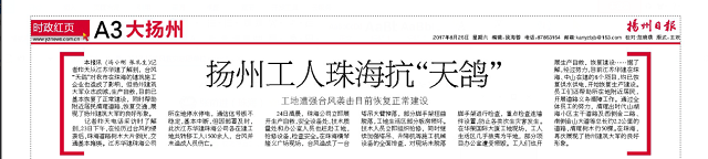 8月23日,珠海遭遇了53年來最強(qiáng)臺(tái)風(fēng)“天鴿”,全市受災(zāi)嚴(yán)重。臺(tái)風(fēng)過后,珠海公司第一時(shí)間迅速組織復(fù)產(chǎn)自救工作,并主動(dòng)聯(lián)系珠海有關(guān)部門,迅速組織志愿者及重型工程車輛投入到社會(huì)道路的清理中去。在這場(chǎng)抗風(fēng)救災(zāi)的戰(zhàn)斗中,珠海公司共疏通社區(qū)道路5條、市政道路3 條,清走倒伏大樹200余棵,運(yùn)送災(zāi)后垃圾 20車次。《揚(yáng)州日?qǐng)?bào)》A3版顯著位置對(duì)公司抗風(fēng)救災(zāi)活動(dòng)進(jìn)行了報(bào)道,點(diǎn)評(píng)江蘇華建珠海公司“眾志成城,生產(chǎn)自救,展現(xiàn)了揚(yáng)州建筑大軍的良好形象”。