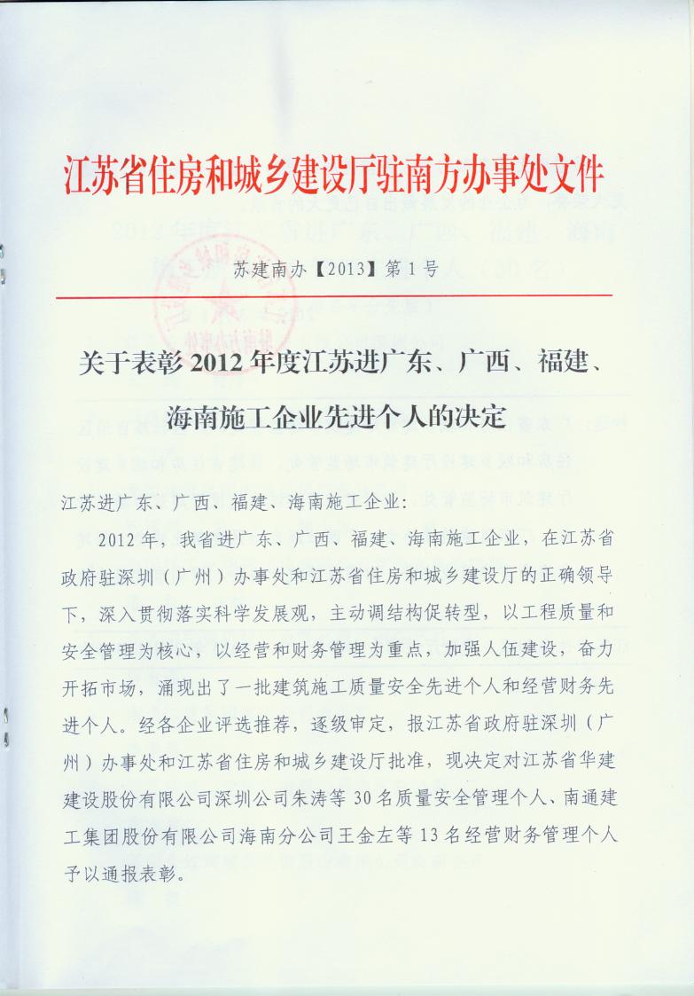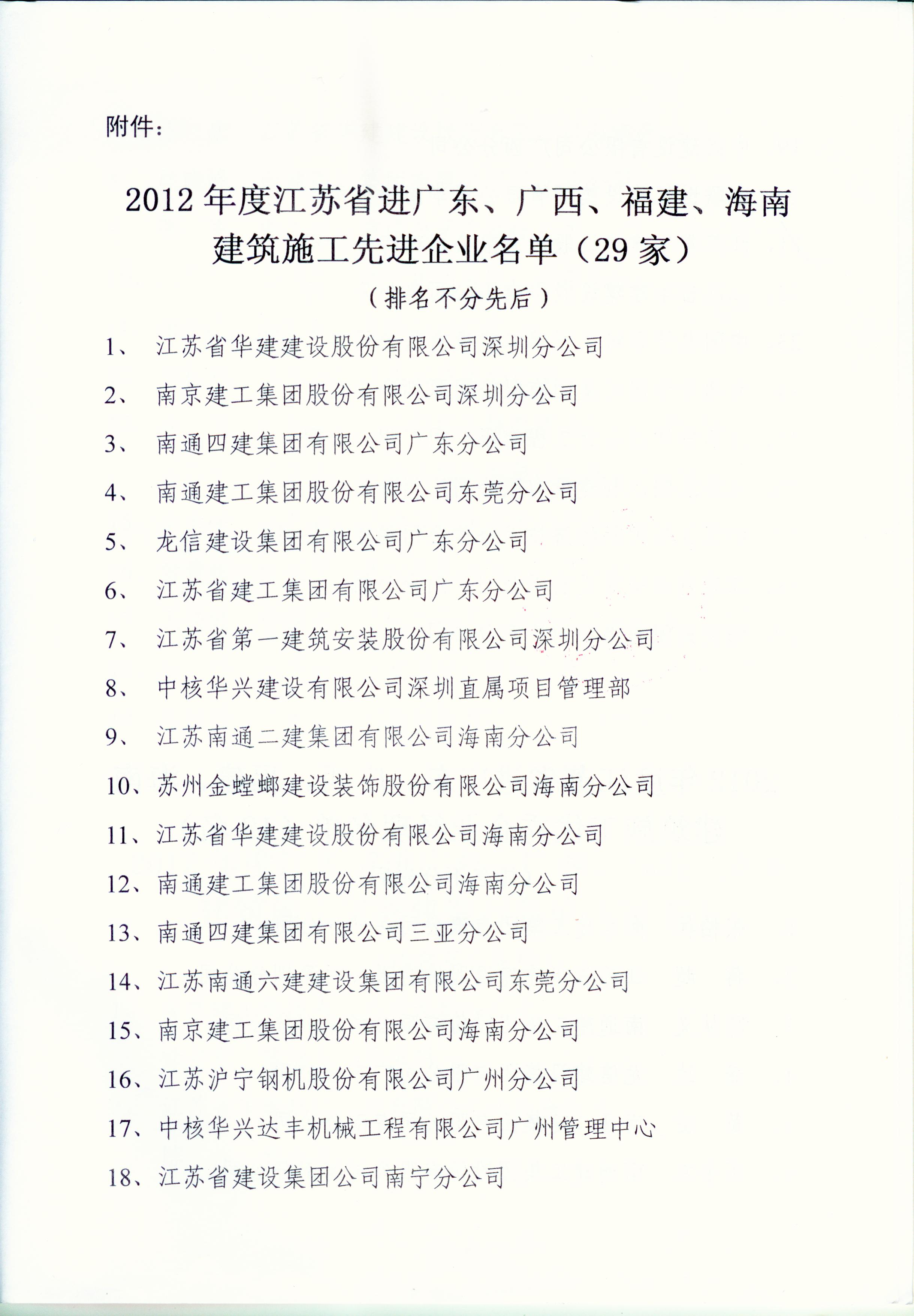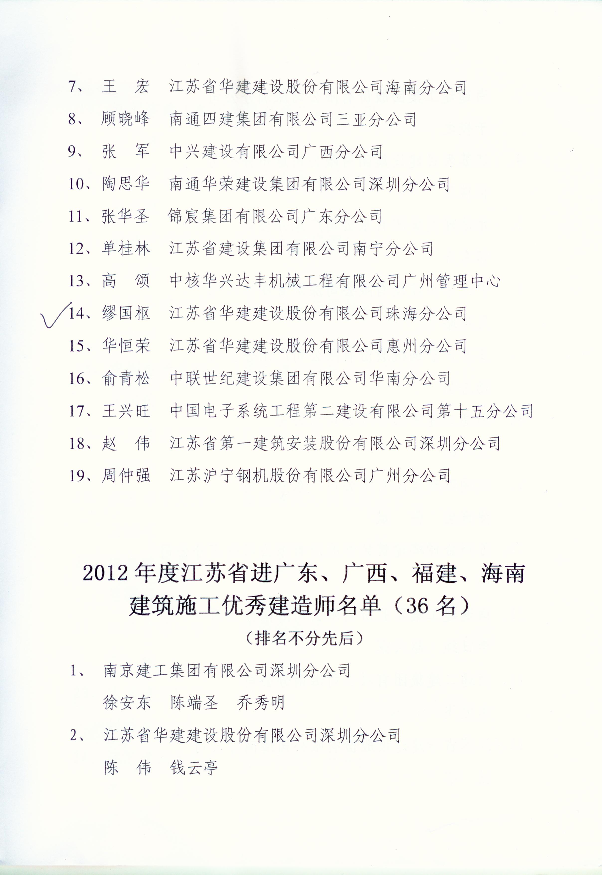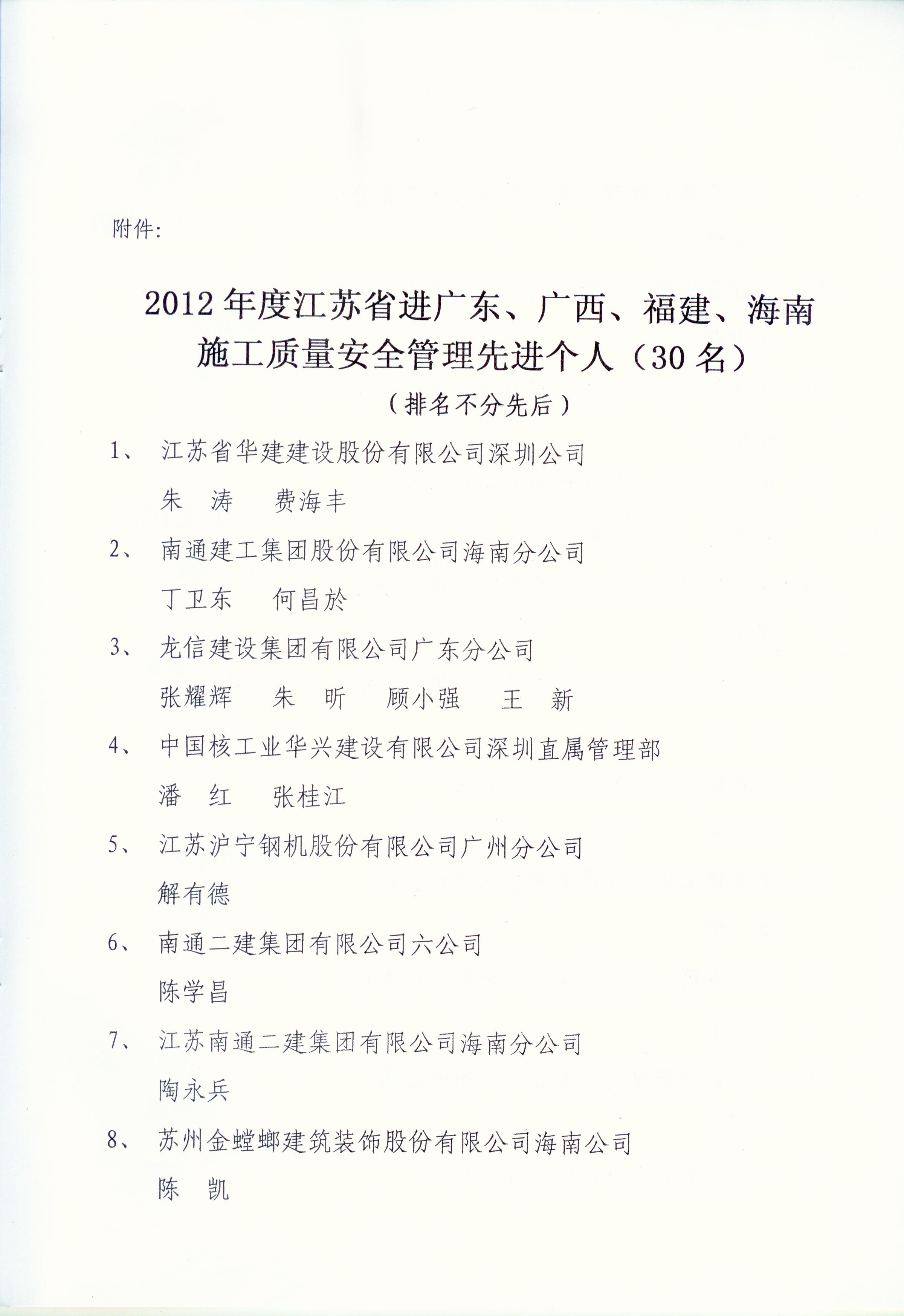 2012年江蘇進粵、桂、閩、瓊建筑施工先進企業(yè)、優(yōu)秀企業(yè)經(jīng)理、優(yōu)秀建造師及經(jīng)營財務(wù)管理、質(zhì)量安全管理先進個人 時間:2013-03-18 4499