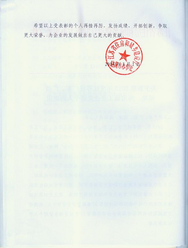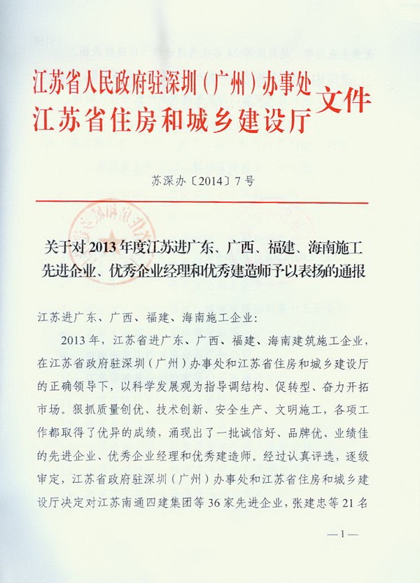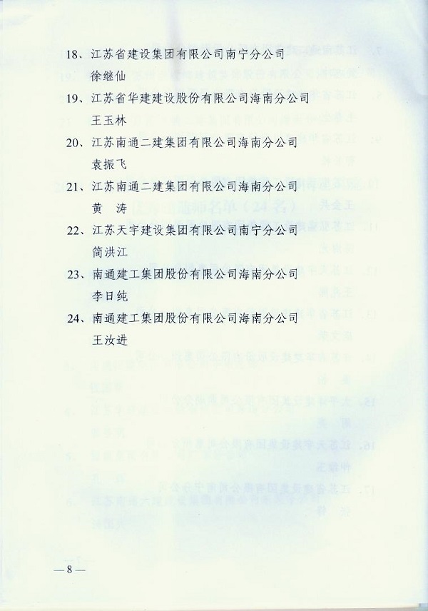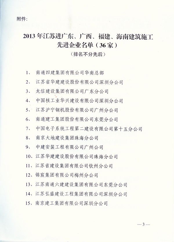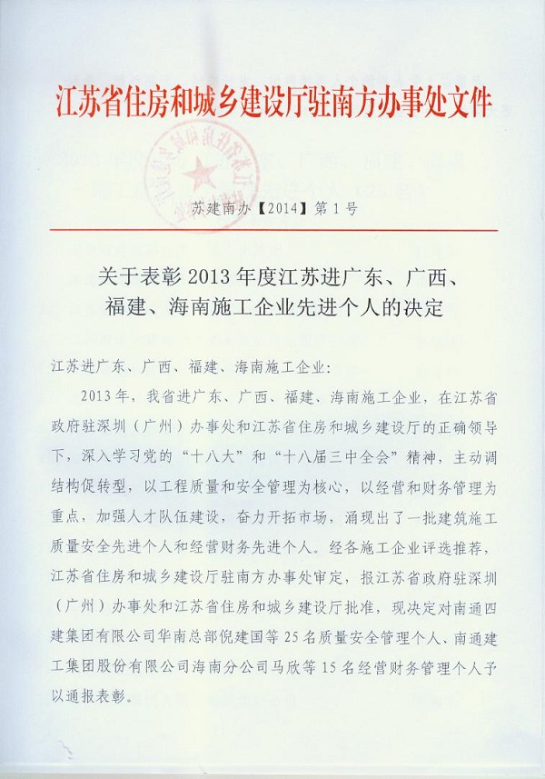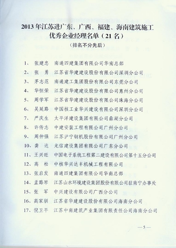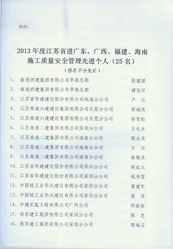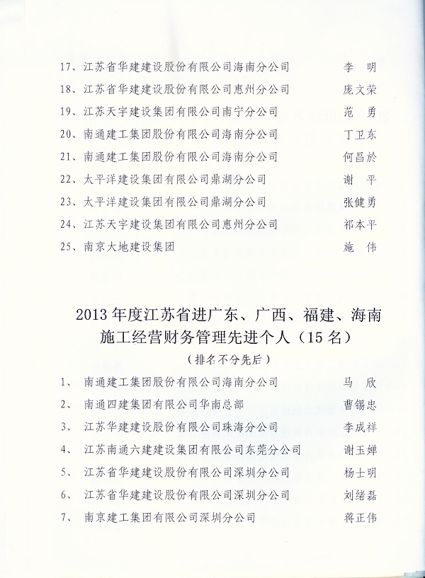 2013年江蘇進粵、桂、閩、瓊建筑施工先進企業(yè)、優(yōu)秀企業(yè)經(jīng)理、優(yōu)秀建造師及經(jīng)營財務(wù)管理、質(zhì)量安全管理先進個人 時間:2014-04-29 4261 0